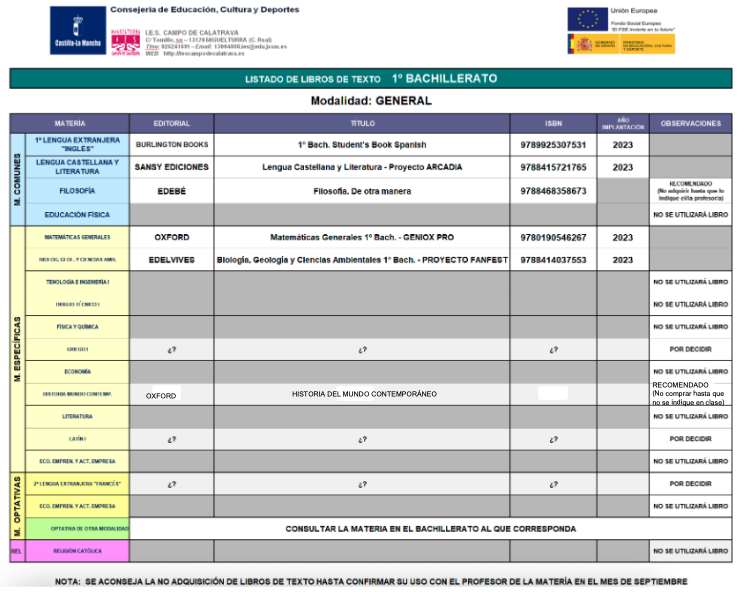 NOTA: SE RECOMIENDA QUE LOS LIBROS DE TEXTO DE BACHILLERATO no se adquieran hasta el comienzo del curso 2025/2026, a excepción de los fijados como libro oficial.