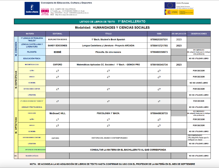 NOTA: SE RECOMIENDA QUE LOS LIBROS DE TEXTO DE BACHILLERATO no se adquieran hasta el comienzo del curso 2025/2026, a excepción de los fijados como libro oficial.